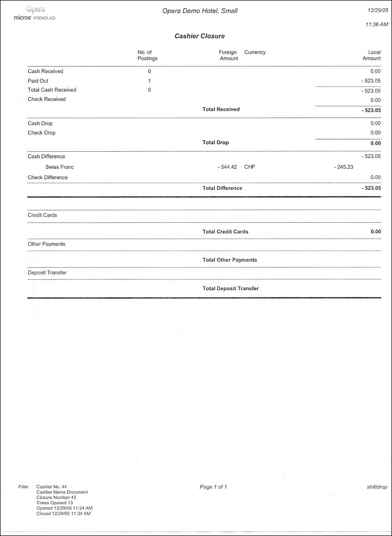 OK. Select the OK button to accept the reconciliation and close the cash drawer. A message will ask you to verify the shift drop balance shown on the Cashier Closure screen. A second message will ask you whether you wish to print the Cashier Reports (most hotels require that these reports be printed). These reports cannot be reprinted or printed from another Opera functional area once the cashier is closed. Moreover, this is also the only opportunity you have to print the consolidated Cashier Closure Report (shiftdrop.rep) for your shift. Finally, a message informs you: "Cashier Closed!"