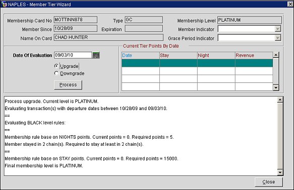 The Member Tier Wizard screen allows you to view a member's upgrade or downgrade information, which includes the member's next tier level, requirements for the next upgrade, and information regarding the member's possible downgrades. The Member Tier Wizard provides a convenient way to view this information and inform guests of the requirements for an upgrade to the next level, as well as how to avoid being downgraded.