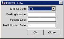 To create a new sales itemizer configuration, place your cursor on a blank line in the grid and select the New button. The Itemizer - New screen appears.